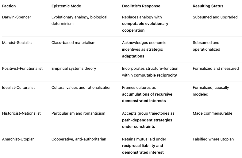 Doolittle’s system is not one among many ideological theories—it is a paradigm shift that renders them commensurable, decidable, and measurable. Where historical factions isolated specific causal dimensions (e.g., biological, economic, cultural), Doolittle reconstructs them as dimensions of evolutionary computation within a universal system of cooperative constraint.
